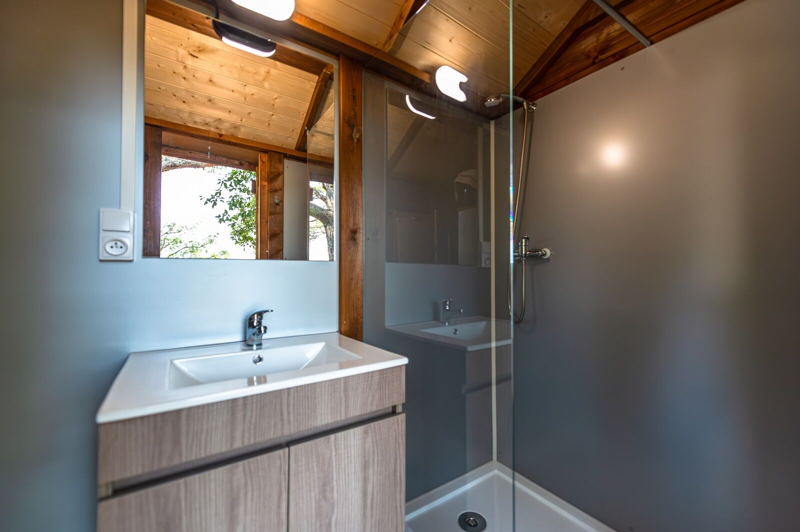 Die privaten Sanitäranlagen, die sich perfekt in die Umgebung einfügen, wurden von einem französischen Unternehmen umweltschonend komplett aus Holz gebaut und bieten Ihnen enorm viel zusätzlichen Komfort während Ihrer Ferien auf unserem umweltfreundlichen Campingplatz.