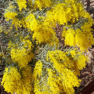 Die ‘Mimosa Acacia Covenyi’, auch bekannt als ‘Blue Bush Mimosa’ oder ‘Blue Leaved Wattle’, zeichnet sich durch ihr silbrig-blaugrünes Laub aus, das während der Blütezeit einen wunderschönen Kontrast zu den leuchtend gelben Blüten bildet.